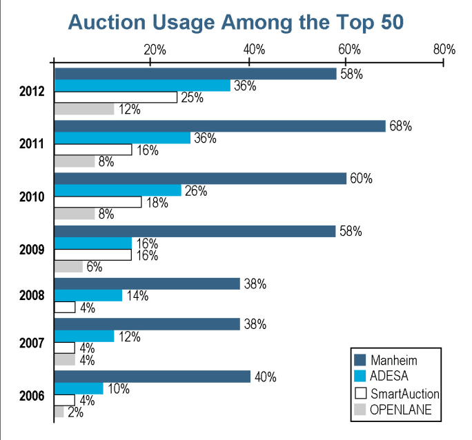 Among auction use for purchasing inventory, 58 percent of independent dealers in the Top 50 reported using Manheim, 36 percent specified that they use OVE (owned by Manheim), 36 percent utilize ADESA, 25 percent purchase from SmartAuction and 12 percent frequent OPENLANE.