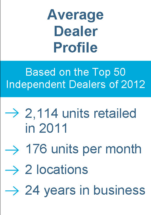 The Top 50 Based on the numbers submitted by the Top 50 Independent Dealers this year, things are continuing to improve in the world of used vehicle retailing, despite recent inventory supply challenges. The Top 50 Independents retailed a total of 105,716 units in 2011, a huge increase of 16,321 over 2010 numbers. The average number of units retailed in 2011 by a Top 50 Independent Dealer was 2,114, a significant increase over the previous year’s average of 1,787. The number of total retail sales among the Top 50 ranged from 7,407 to 720.