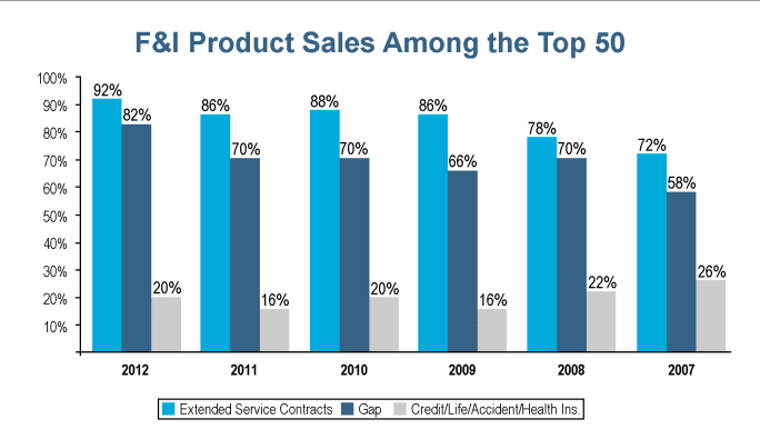It seems that more independents are going for the additional profit provided by back-end products. Only six percent of the Top 50 said they do not sell any finance and insurance products. A whopping 92 percent of dealers reported offering extended service contracts, up from 86 percent last year, while 82 percent offer GAP and 20 percent offer credit/life insurance, up from 70 percent and 16 percent last year, respectively. Independents reported getting their F&I-related products from 84 different providers, but no single F&I product provider dominated the market.