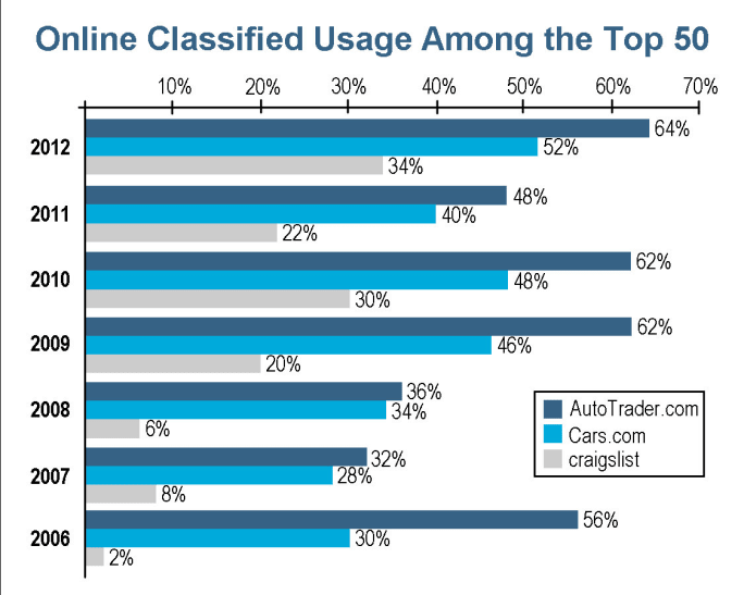 When it comes to utilizing third-party classified or auction sites to market and sell vehicles, 74 percent reported making use of such outlets, up from last year’s 64 percent. Of those dealers, 64 percent are using AutoTrader.com, 52 percent are using Cars.com, 34 percent are using craigslist and 26 percent are using eBay. These were also the four most popular sites with independents for marketing and selling vehicles the previous year; however, this year, craigslist, which can be utilized by dealers for free, edged out eBay in popularity.