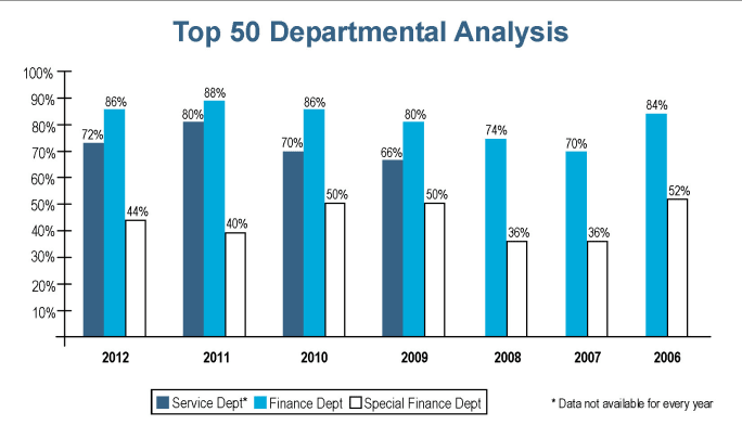 Of this year’s Top 50 Independents, 72 percent reported having a service department, down slightly from the 80 percent reported last year. Down only slightly from last year’s 88 percent, 86 percent of the independents reported having a dedicated finance office while 44 percent said they maintain a dedicated special finance office, four percent higher than what was reported last year.