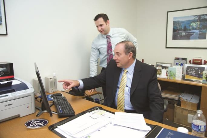 Pacifico Marple’s dealer principal, Michael Pacifico (seated), reviews the results of the dealership’s proximity marketing campaign with General Sales Manager Jeremy Fisher.