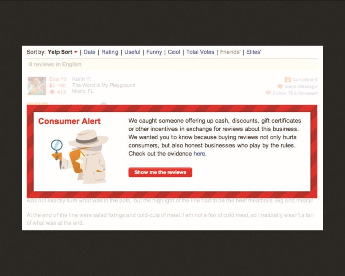Yelp also sets up sting operations in which it responds to ads on classified sites such as Craiglist. If a business expresses interest in hiring someone to post fake reviews, Yelp team members will flag that business page with what Lowe refers to as a “shame component,” a consumer alert pop-up message that reads: “We caught someone offering up cash, discounts, gift certificates or other incentives in exchange for reviews about this business. We wanted you to know because buying reviews not only hurts consumers, but also honest businesses who play by the rules. Check out the evidence here.”