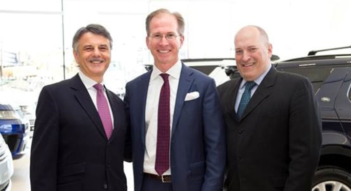 Dr. Ralf Speth, CEO of Jaguar Land Rover (left), and Joe Eberhardt, president and CEO of Jaguar Land Rover North America (right), joined Dealer Principal Jack Weidinger at the grand opening of Jaguar Land Rover Freeport (N.Y.). Photo courtesy Jaguar Land Rover